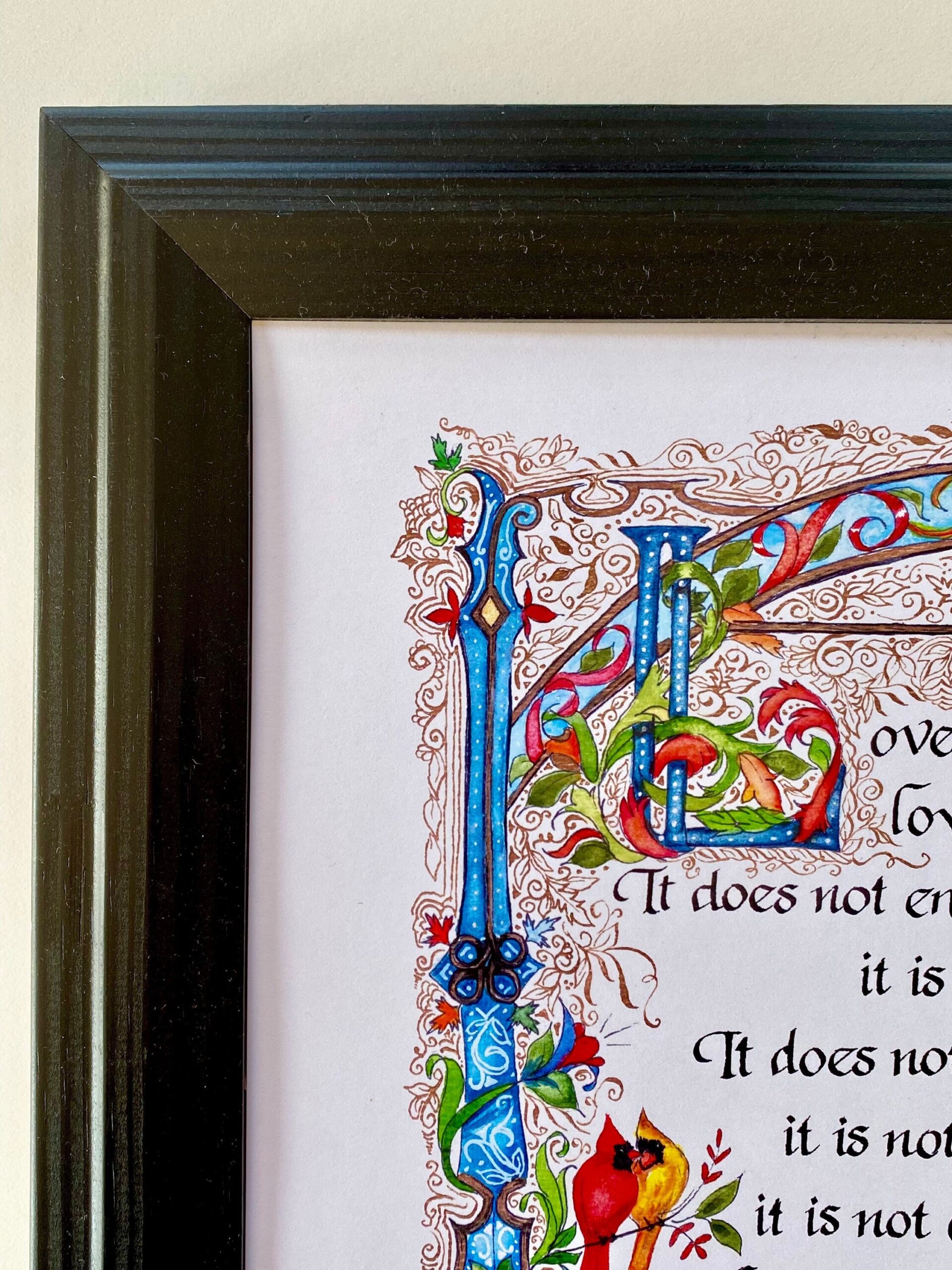 The perfect gift for any home. The original was done for a 50th wedding anniversary. Cardinals, wedding bands, infinity knit, oak leaves & more were incorporated to help remember the Ultimate Lover of our souls. 11×14/ Paper Only The prints from my Etsy Shop are high quality & laser printed in a local reputable print shop. They are on 80 pound Cover Copy. If you are looking for an even greater quality, archival, acid free, reproduction of this piece, please visit AshleyChristineCalligraphy.com. There you can choose the medium you prefer. My recommendation is watercolor paper, as this produces a vibrance even greater than the originals. A wide verity of dimensions is provided as well, & often less expensive depending on the size. The photo of this piece over the couch is from the AshleyChristineCalligraphy.com website. 22×30 inches. This size is not offered in the Etsy shop. Valentine’s Day Gift for her Anniversary gift Cardinals Wedding bands 1 Corinthians 13/Wedding/Valentine’s Day/Gift For Him/For Her/Custom/Print Of By Hand/Old World Calligraphy/Bible Art/Wall Art/11×14