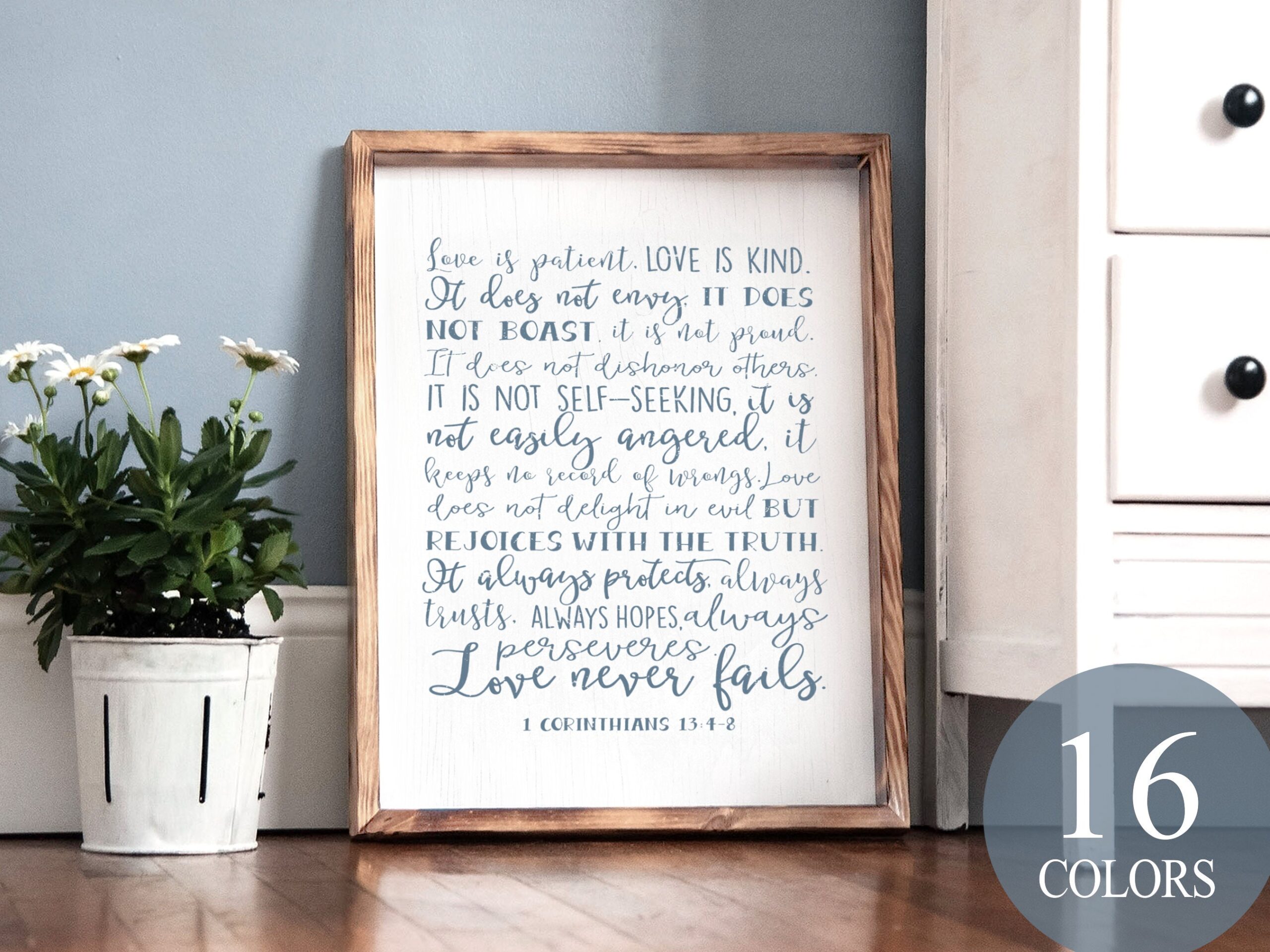 1 Corinthians 13:4-8, inspirational saying, scripture gift, farmhouse inspirational saying, encouraging saying, Love is sign, religious saying, Bible verse, rustic wedding, wedding sign, love never fails, farmhouse sign, framed wood sign Every detail on our wood signs is thoughtfully hand crafted in the USA. We print directly on wood, not foam board or particle board. Each sign is treated with a white coating that leaves a hint of wood grain. The quality is instantly noticeable from across the room! We offer 16 popular colors, & we’re happy to offer custom colors if necessary. Buy more & save! When you buy more, we save on production costs & we’re passing all those savings on to you! Save 20% when you buy 2 items, & 30% when you buy 3! No coupon code needed! All discounts will apply automatically at checkout. Ships next day! All our orders ship on the same or next business day! We cannot ship on weekends or holidays. For personalized & custom orders, we may ask you to approve a preview before we begin production. Please note that these orders may take slightly longer. Please message us with any shipping questions! 1 Corinthians 134-8, Inspirational Saying, Scripture Gift, Farmhouse Encouraging Love Is Sign, Religious