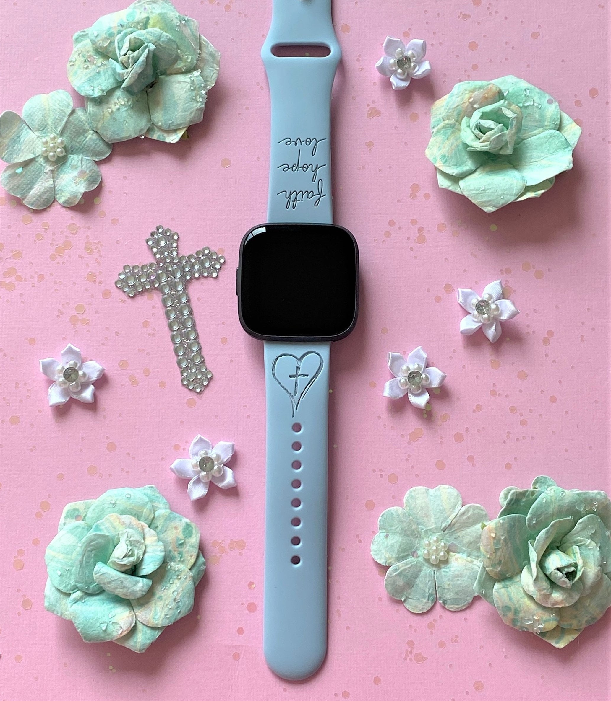 Your engraved Fitbit Watch Band is handmade & therefore unique & one of a kind! Color in photos: Sky Blue Watch Compatible Models: Fitbit Versa/Versa 2/Versa Lite Watch Band Lengths: – Small fits wrist circumference 5.1-7.1 inches (130-180 mm) – Large fits wrist circumference 5.9-7.9 inches (150-200 mm) Watch Band Material: Silicone If you have any specific pattern requests, please message me. 🙂 Any questions, comments, or concerns…please feel free to contact me. Cross Fitbit Versa/Versa 2/Versa Lite S/L Silicone Engraved Religious Christian Bible Faith Hope Love Watchband Replacement