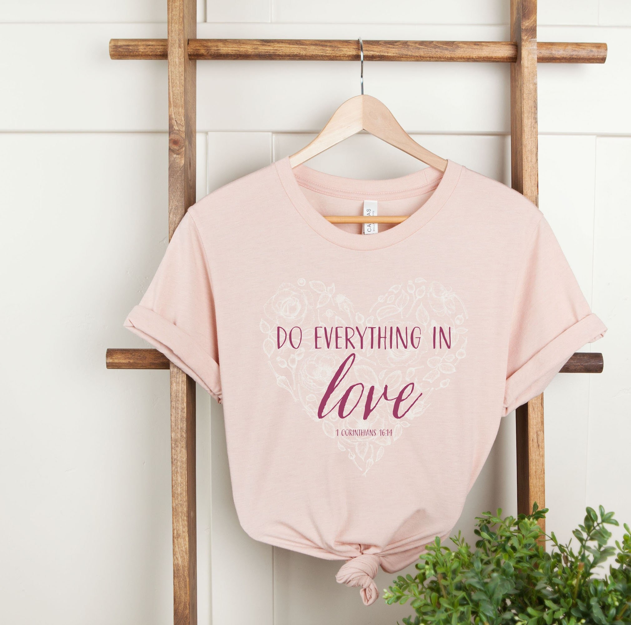 PLEASE READ BEFORE PURCHASING: All physical (non-digital download) items purchased from the shop are made on demand when an order is placed at our fulfillment center in Chatsworth, CA & usually ships within 1-2 weeks. Please note that these timeframes vary with our fulfillment center & may be faster or slower depending on the time of year. Once your package has left the fulfillment center, Petite Fleur Studios cannot guarantee delivery timing via the postal carrier. Please check the estimated arrival times prior to placing your order. Colors may vary slightly in real life depending on the screen. This listing is for a unisex sized item – please see sizing chart in listing photos to best determine sizing. Returns will not be accepted based on color variance or for purchasing the wrong size. By purchasing this item from Petite Fleur Studios, you understand that once you place an order, there will be no cancellations accepted since this item is made to order & the fulfillment process starts as soon as an order is placed. ITEM DESCRIPTION: This sweet & feminine design makes this t-shirt a perfect Mother’s Day or birthday gift for a special lady in your life! This tee is everything you’ve dreamed of & more. It feels soft & lightweight, with the right amount of stretch. It’s comfortable & flattering for every mother. 100% combed & ring-spun cotton (Heather colors contain polyester) Heather colors are 52% combed & ring-spun cotton, 48% polyester Fabric weight: 4.2 oz (142 g/m2) Pre-shrunk fabric Side-seamed construction Shoulder-to-shoulder taping Thank you for looking, & may God bless you! + AMDG + Do Everything in Love Floral Women’s T-Shirt – Catholic St. Valentine’s Day Tee 1 Corinthians 1614 Christian Clothing