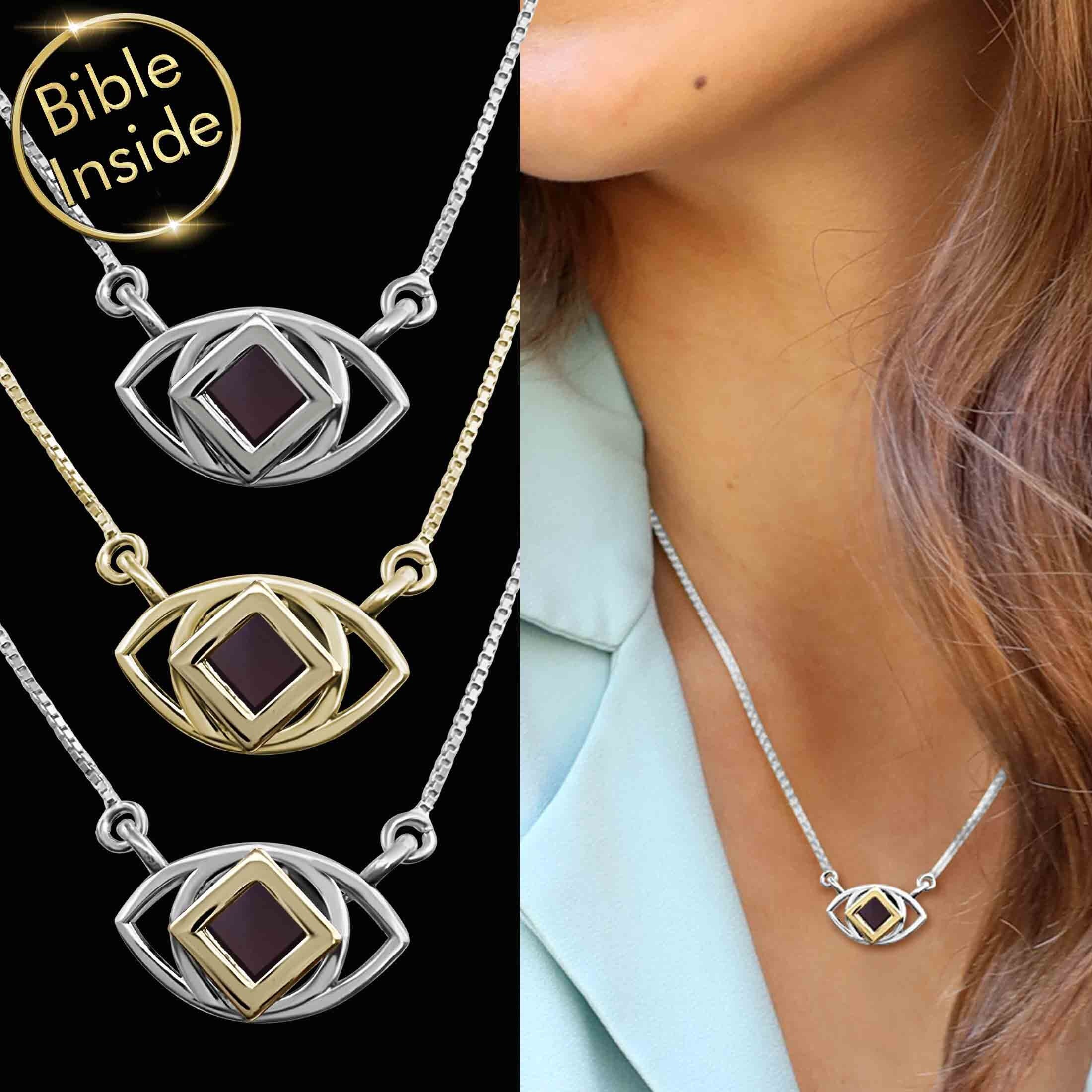 Classic Dainty Eye Nano Bible Pendant for Women, 14k White or Yellow Gold, 925 Sterling Silver with 9k Gold pendant, Spiritual Jewelry Religious Gift for Her Shipped from Israel Sustainable features: recycled metal, upcycled. Items may include additional materials or use methods that aren’t considered sustainable features on our site. Learn more in the personalization box, please select your preferred bible version Recycled FREE Express UPS shipping! This Unique Design pendant with a Nano Bible features the entire Old or New Testament inscribed with microscopic precision on a tiny 0.5 cm/ 0.2″ nano sim, nestled within a precious piece of jewelry. It is handmade in Israel using state-of-the-art innovative technology developed exclusively by us! Contrary to the commonly used gluing method, all our Nano Bible pieces are INLAID with the Nano Bible sim, rendering the Bible safe & sound, protected from getting detached & falling off the pendant! Keep the Holy Book close to your heart, with you, on you, always! ✥✥ ITEM DETAILS ✥✥ ✦ The engraved bible: >> DEFAULT VERSION: The New Testament (KJV) English (27 books). This is the version that will be sent to you unless you specify otherwise. If you wish to have the Old Testament in Hebrew (24 books), please send us a note when placing the order. ✦ Water-resistant & durable ✦ Material: 14k Gold, 14k White Gold, Silver 925 with 9k Gold ✦ Chain length options: 42cm (16.5″) / 45cm (18″) / 50cm (20″) / 60cm (24″) Eye Nano Bible Bracelets: https://www.etsy.com/il-en/listing/1459465972/third-eye-link-chain-bracelet-with?click_key=41f5e0942bb7c0e229c8921031b5c20641366da2%3A1459465972&click_sum=9bc87c0e&ref=shop_home_active_1&pro=1&frs=1 ✥ WHAT is NANO Bible? ✥ in 2009, Israeli President Shimon Peres presented Pope Benedict with the Old Testament printed on a nanotechnology particle. We created a collection based on this same technology that features microscopic versions of both the Old & New Testaments. The New Testament includes: 27 books 260 chapters 7,957 verses 188,957 words 786,662 letters Average letter size: 3.5 microns Line thickness of a letter: 950 nanometers (0.95 microns). The Old Testament includes: 24 books 929 chapters 23,204 verses 306,757 words 1,202,972 letters Average letter size: 2.9 microns The line thickness of a letter: 700 nanometers (0.7 microns). As unbelievable as it may sound, the entire text of the Old or New Testament (24 or 27 books respectively) is inscribed with a microscopic precision on a tiny 0.5 cm/ 0.2″ square. The nano Bible sim can only be read under a 1000x microscope. We are an Israeli-based innovator & state-of-the-art technology creator. Our unique in-house developed know-how & methods are servicing the whole jewelry industry. The New Testament KJV (King James version) of the Nano Bible includes all 27 books written in English: Matthew, Mark, Luke, John, Acts of the Apostles, Romans, 1 Corinthians, 2 Corinthians, Galatians, Ephesians, Philippians,