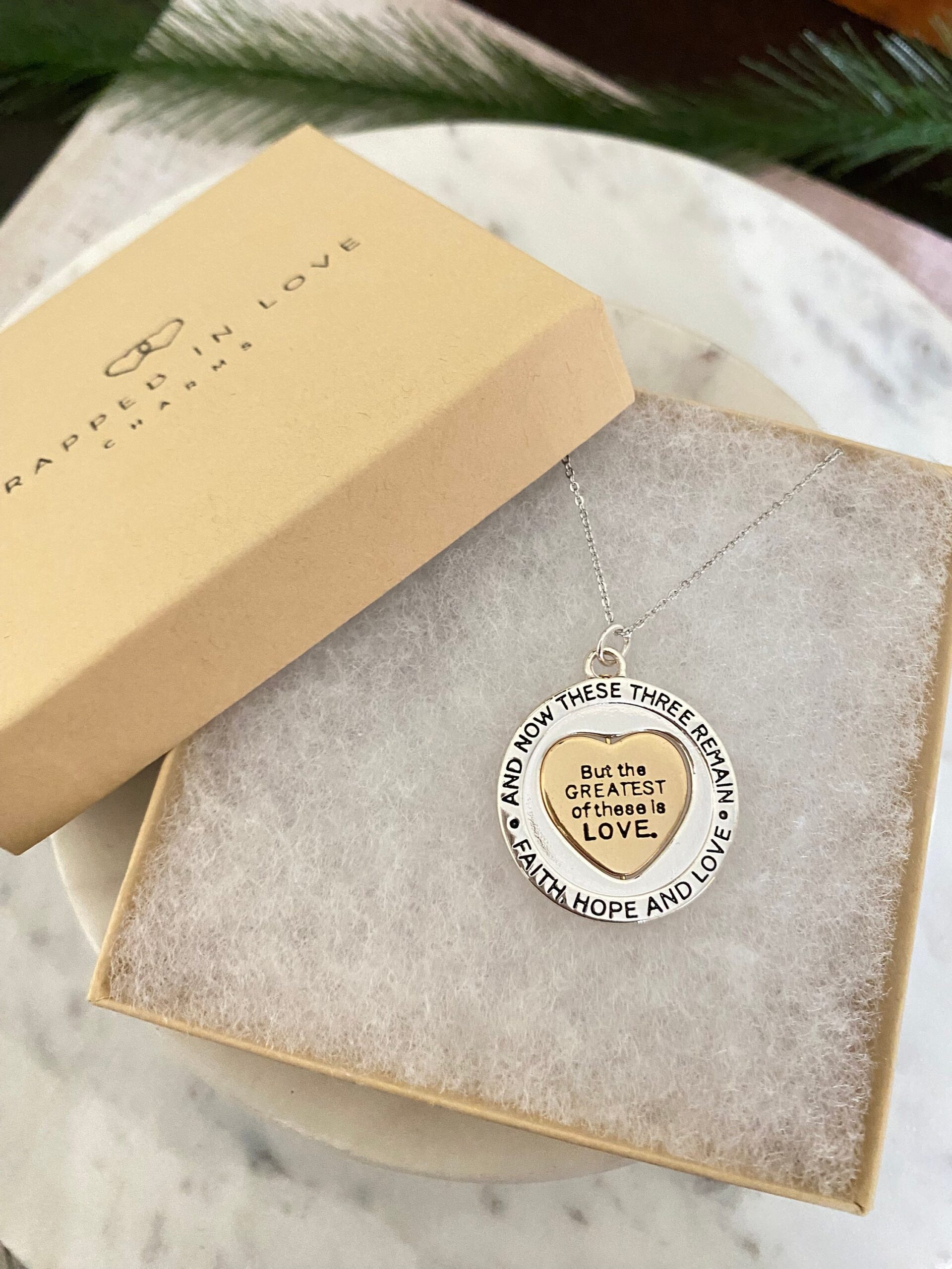 Beautiful Stainless Steel Necklace with a gold plated pendant engraved with 1 Corinthians 13:13. But The Greatest of these is Love, Faith Necklace, Christian Jewelry, inspirational jewelry. Faith Hope & Love Bible Verse Spinner Necklace, 1 Corinthians 1313, Christian Gifts, Scripture Jewelry, Love Gift For Her