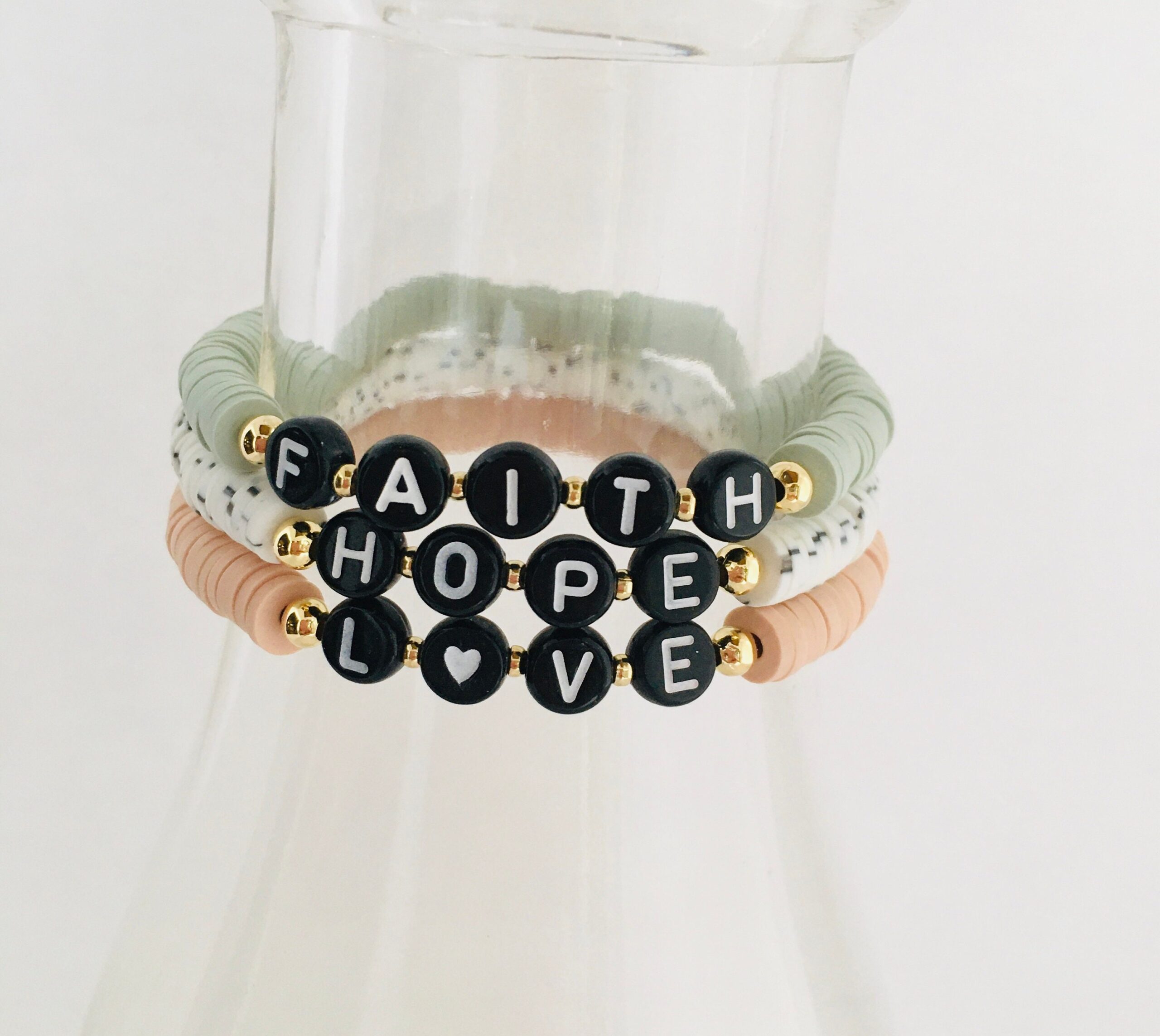 Faith, Hope, Love Bracelet Stack, Set Of 3 Vinyl Heishi Bracelets, Custom Word Valentine Gift, Inspirational Bracelets