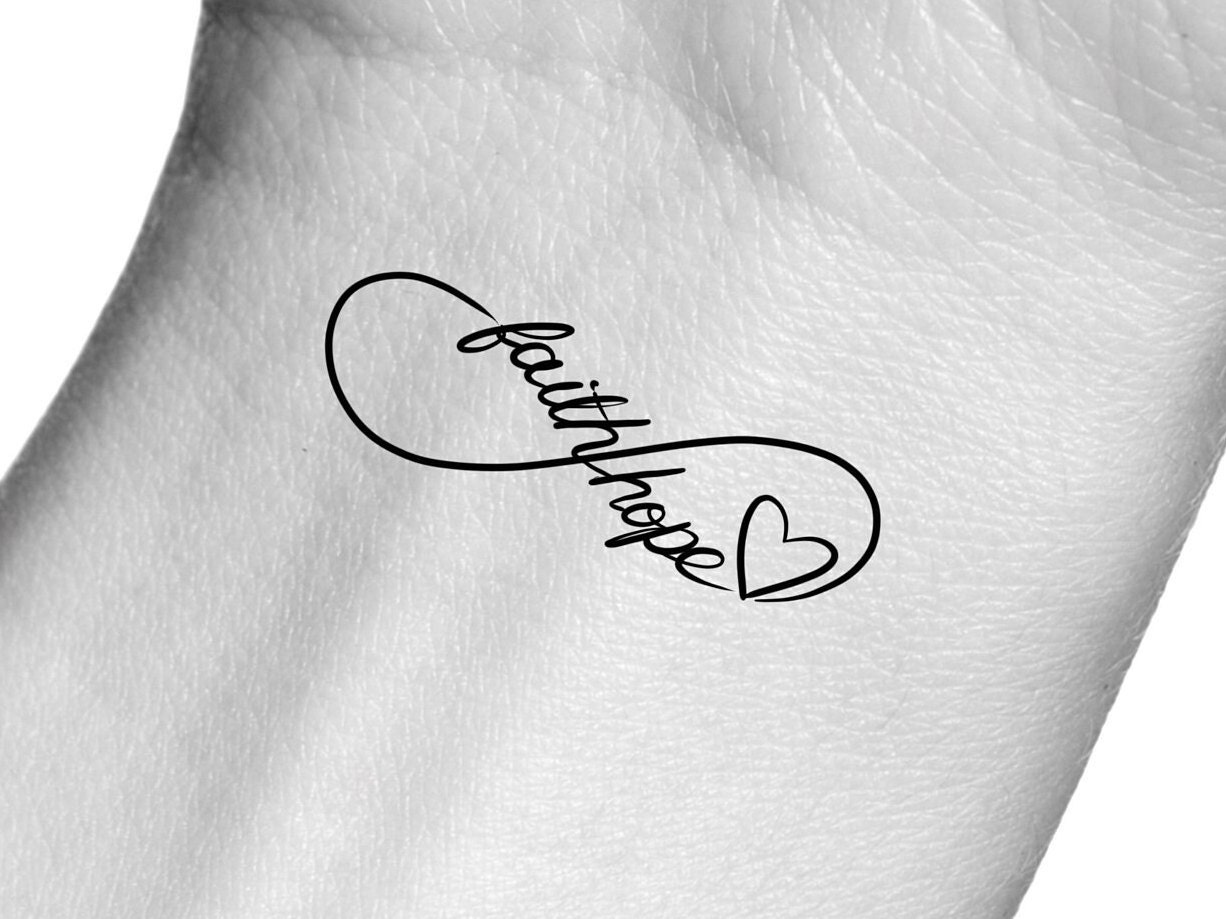 Faith Hope Love Infinity Temporary Tattoo Size: The size of this Temporary Tattoo is approximately 1 1/2 inches in length. If you would like this design in a smaller or larger size that isn’t already listed, please message us directly on Etsy BEFORE placing your order so we can provide you with accurate pricing. Directions: 1. Cut excess paper around tattoo with scissors to eliminate any unnecessary adhesive on your skin after applying. 2. Peel away & discard the clear plastic layer. 3. Apply the tattoo image side to your skin & cover with a damp cloth for 20 seconds. 4. Carefully peel back paper off of your skin & allow the tattoo to dry for at least 10 seconds. Do not touch it. 5. After allowing for dry time, your tattoo should be smooth to the touch & last between 1-3 days. Temporary Tattoo Longevity: Once you apply the tattoo & it is fully dry, avoid anything rubbing on it & don’t get it wet. If the tattoo gets wet, it will dissolve the protective layer exposing the sticky adhesive underneath. The same thing can occur if you try to adjust the placement or peel the edge after the tattoo is already applied. If you avoid any rubbing & do not get the tattoo wet it can last between 1-3 days. Some customers have had the temporary tattoos last up to a week with listening to the proper aftercare instructions. Custom Tattoo Inquiry: Please message me on Etsy if you would like to customize or add to any of my listed designs OR if you have a custom tattoo design inquiry. If you add a “Note to Seller” to request customization with your order to a listed tattoo that does offer customization, I cannot guarantee your request will be granted. Pricing for custom tattoos vary. Bulk Orders: Please message me on Etsy if you would like a bulk order of 20 or more quantity temporary tattoos! I do offer special bulk pricing. I also always run the sale of Buy 5 Get 20% Off your order. Shipping: I have a fast turnaround time that is typically set at 1-3 business days, I try to get orders out the next business day. With my free standard shipping your order would be sent out in a small envelope with USPS. This shipping method comes with PARTIAL tracking & is advertised at 2-6 business days although could sometimes take a few more business days additionally. With my FREE standard shipping I cannot guarantee a delivery date. If you order is time sensitive & you need it to arrive by a certain date, please keep that in mind when choosing your shipping option at checkout. I can only guarantee a delivery date with my UPGRADED shipping options at checkout. Thank you for your understanding. Faith Hope Love Infinity Temporary Tattoo