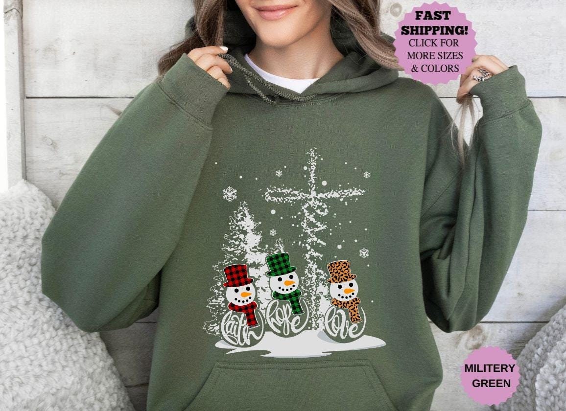 All of our shirts are Unisex.All designs are DTF printing no embroidery or anything else. We have different Brands of shirts all same sizing & quality. in order to ship your items faster we provide whichever is available in stock. Message me for any questions. Faith Hope Love Jesus Snowmens Christmas Sweatshirt, Christian Family Xmas Trip shirt, Christmas Snowmens Hoodie, Cute Winter Snowmens shirt – How To Order – 1) Please make sure to check all photos in the listing 2) Choose your T-shirt color & size 3) Enter your Text/Design Color in The Personalization Box 4) Click add to cart. You can go back & follow the same steps to add more items in your cart 5) Click “Proceed to check out” 6) Add your shipping address & choose your shipping method 7) You can write a note to the seller for any requests before checking out – T-SHIRT FEATURES Superior airlume combed & ring-spun cotton -Crew neck -Short sleeves -Side-seamed -Retail fit -Unisex sizing -Shoulder-to-shoulder taping – CARE INSTRUCTIONS – Wash item inside out in warm/cold water, non-chlorine bleach only, do not dry clean, do not iron directly on decoration. – PRODUCTION & SHIPPING – Processing is 1-3 Business Days. Shipping is 2-5 Business Days (after processing time). If you need item sooner upgrade shipping in the cart. Thank you for your purchase !! Faith Hope Love Jesus Snowmens Christmas Sweatshirt, Christian Family Xmas Trip Shirt, Hoodie, Cute Winter Shirt