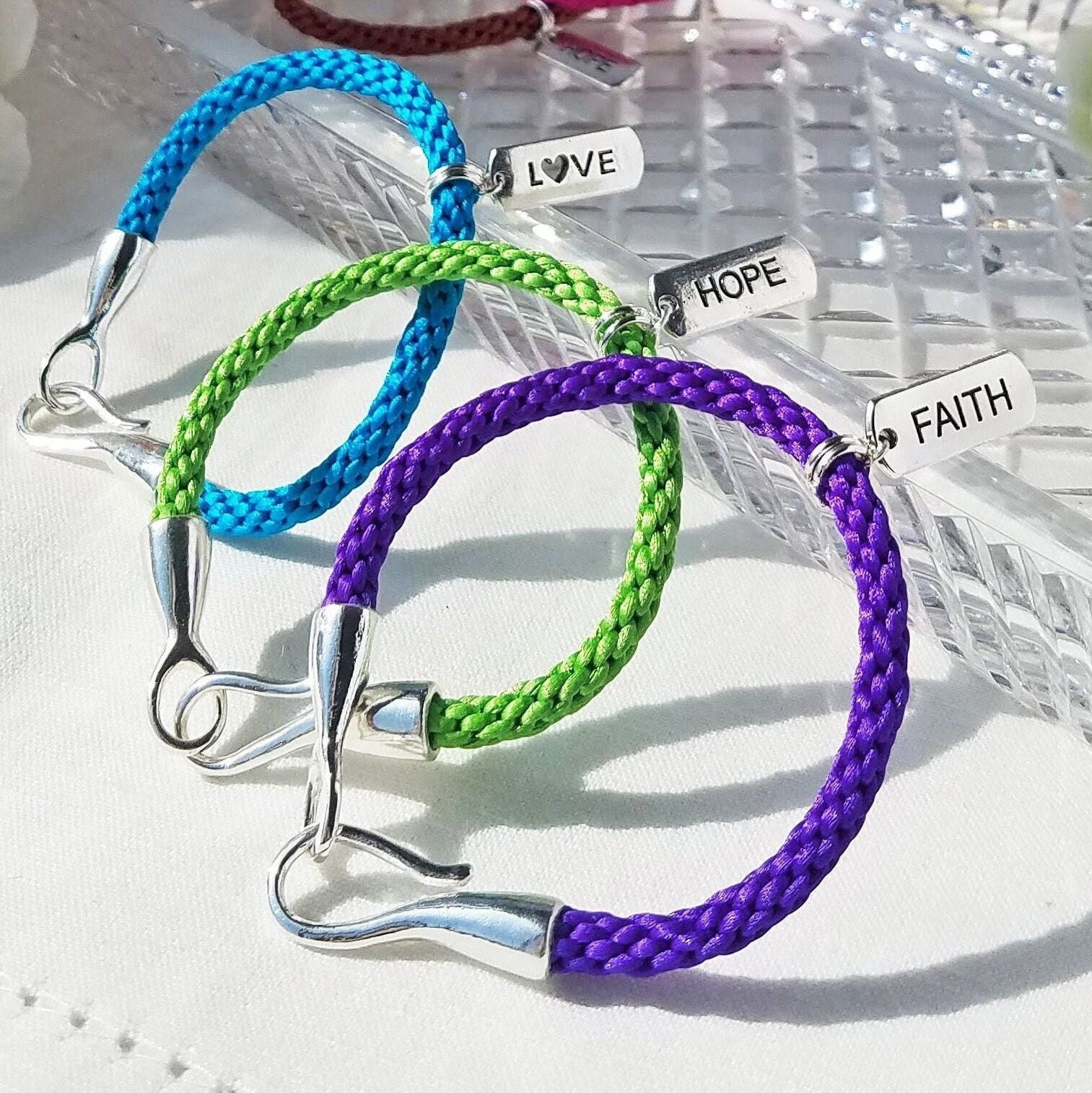 Faith Hope Love Spiritual Charm Bracelet Hand-Woven Satin Thread With A Silver Word & Matching Hook Clasp. Available in 28 Colors
