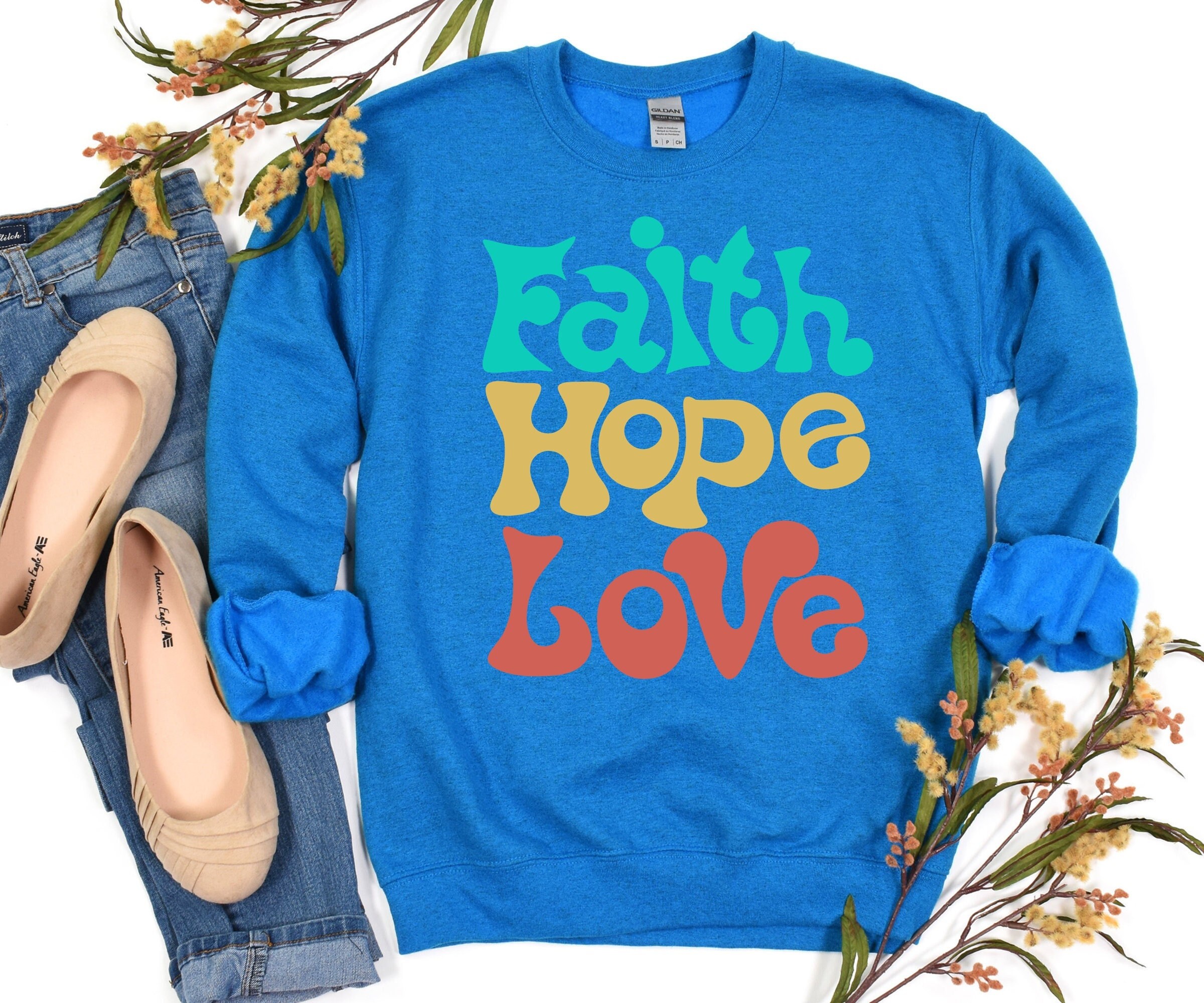 Faith Hope Love Sweatshirt, Faith Gift, Christian Sweatshirt, Faith Cross Sweatshirt, Christian Gift, Love & Grace Shirt, Love Sweatshirt Show your faith with this Christian Sweatshirt! At Bright Week Works there is no such thing as an unsatisfied or unhappy customer because we are delivering the best possible customer service, after sale support & product quality out here in the market. All of the shirts are made to order by our professional team with utmost care & dilligence to ensure the best possible service for you with the best, top quality printing solutions out here in the market. We guarantee that you are going to get the best service from placing the order to delivery. Our Shirts are top-notch material, best in the market. We are working with the biggest apparel companies & making sure that you get the best products in the market. As promised you won’t regret choosing us. Thank you for your support & we appreciate your business. Ideal for any situation, a unisex heavy blend crewneck sweatshirt is pure comfort. These garments are made from polyester & cotton. This combination helps designs come out looking fresh & beautiful. The collar is ribbed knit, so it retains its shape even after washing. There are no itchy side seams on these sweaters. .: 50% cotton, 50% polyester .: Medium-heavy fabric (8.0 oz/yd² (271.25 g/m .: Loose fit .: Sewn-in label .: Runs true to size Faith Hope Love Sweatshirt, Gift, Christian Cross & Grace Shirt, Sweatshirt