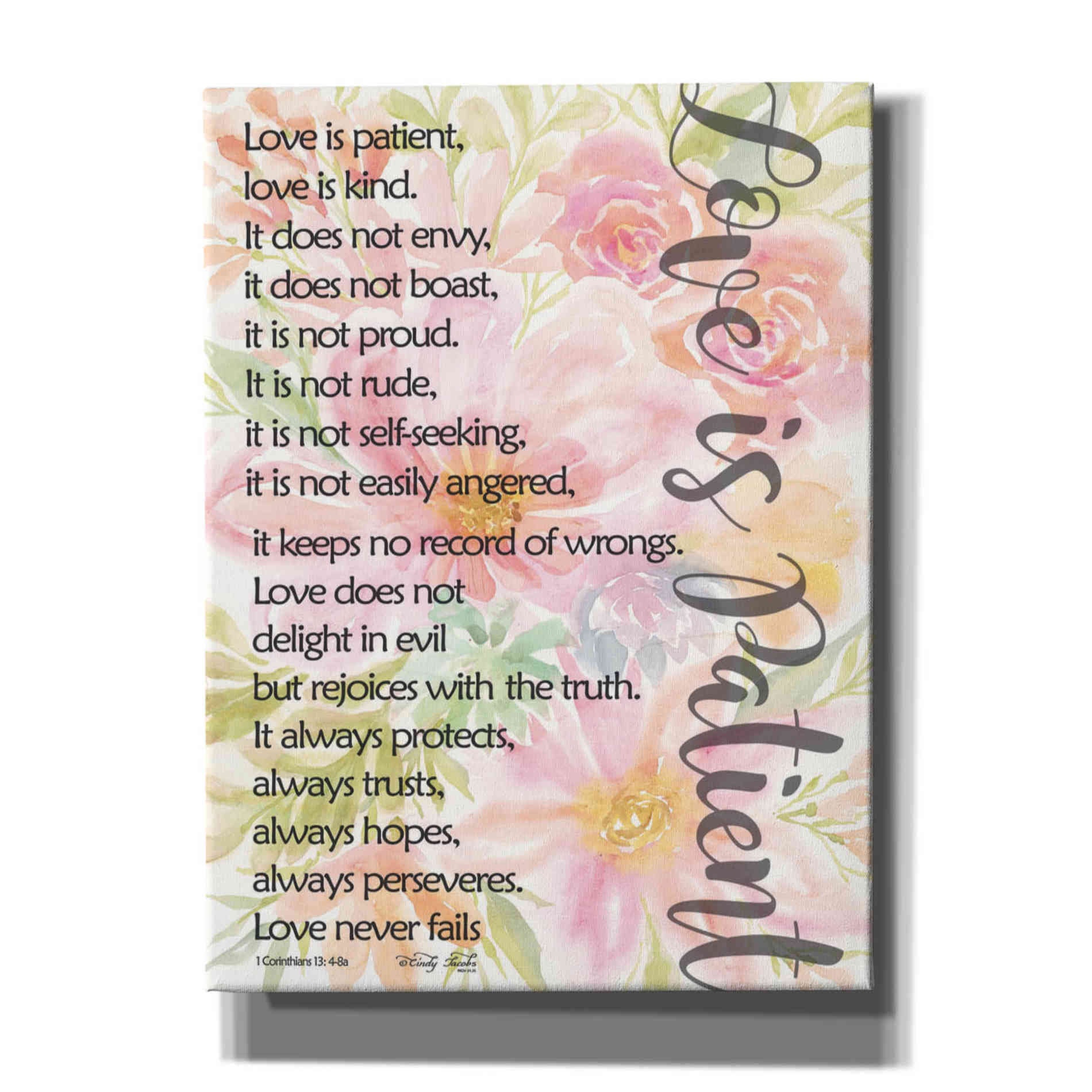 “Floral Love is Patient” by Cindy Jacobs. Paint & create is what Cindy loves to do best! She appreciates every texture, medium, & subject of it. Her inspiration comes from her memories back on the farm of Nebraska. Her family also played a huge role in her inspirations: aunts, uncles, & even cousins alike. She thanks her God-given gift to everyone. This is reflected in the bible verses & images of her artwork. “When all is said & done, it will be about people & the bonds that were shared over meals & artwork” Giclee artwork, printed on high quality archival grade canvas, Made in USA Stretched over solid wood bars & ready to hang Officially Licensed Digital Print, Artist: Cindy Jacobs Made in USA Floral Love Is Patient By Cindy Jacobs, Canvas Wall Art
