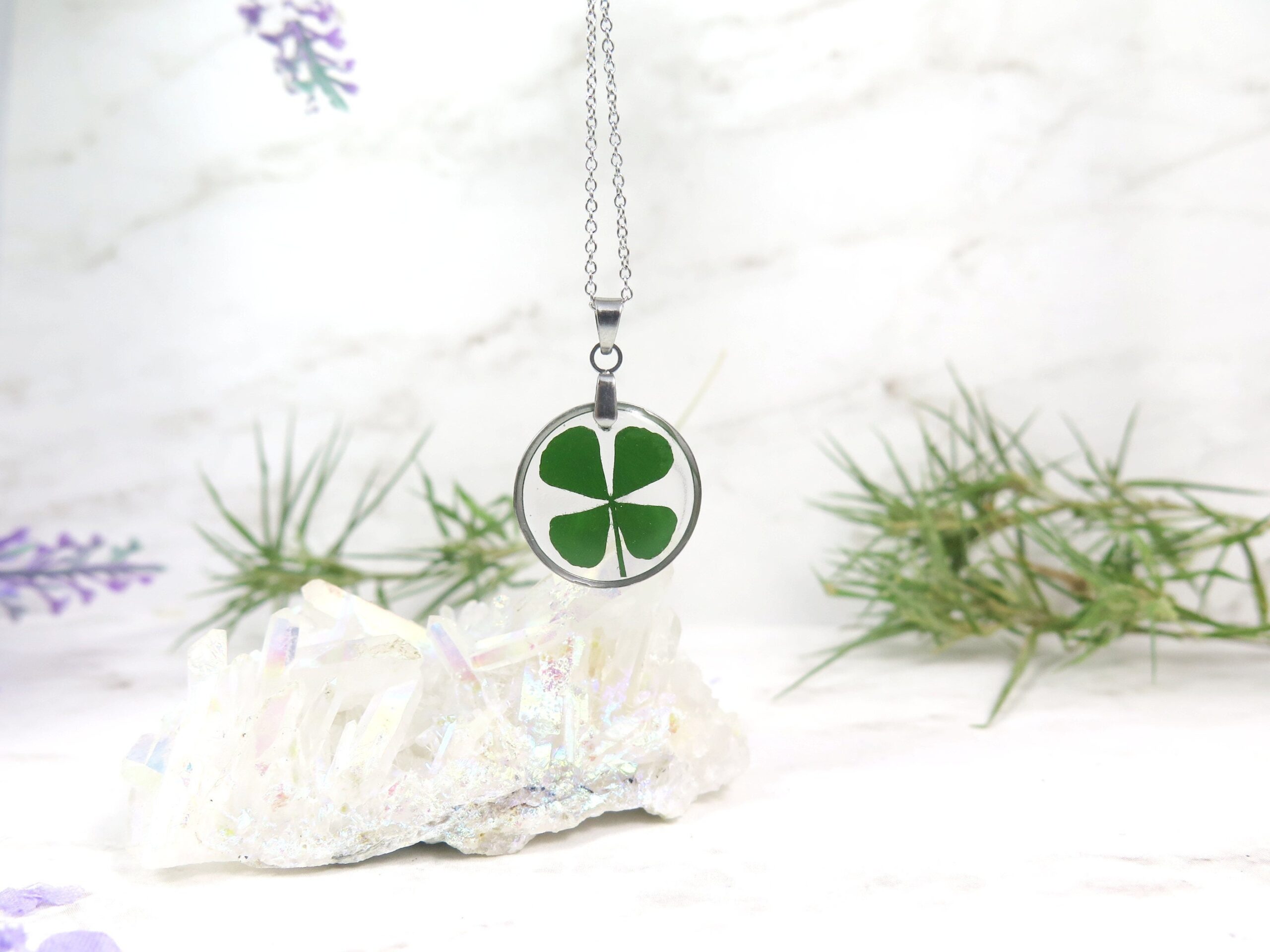 Four leaf clover necklace – Shamrock lucky charm – Gift for women This listing is for a lovely botanical necklace that features real dry four-leaf clover in jeweler’s grade resin. This Elegant Pendant will make an Eye-Catching Accessory for Any Outfit A 4 leaf clover is a rare find & a true treasure. It can symbolize anything you choose, or wish for, & is a unique, & appropriate gift for anyone, of any age. Each of the leaves of the 4-leaf clover is represented by faith, hope, love, & of course, good luck. The pendant – circle stainless steel frame- measures about 7/8″(about 23 mm) & comes with a choice of 16″ 18″ 20″ 22″ & 24″ Hypoallergenic Surgical Chain Each piece is handmade from real pressed flowers. Your design may vary slightly from the picture as each piece is one of a kind! Each finished jewelry listing will arrive ready to gift in a silver gift box Find my home page here: https://www.etsy.com/shop/SmileWithFlower?ref=hdr_shop_menu Four Leaf Clover Necklace – Shamrock Lucky Charm St. Patricks Gift For Women