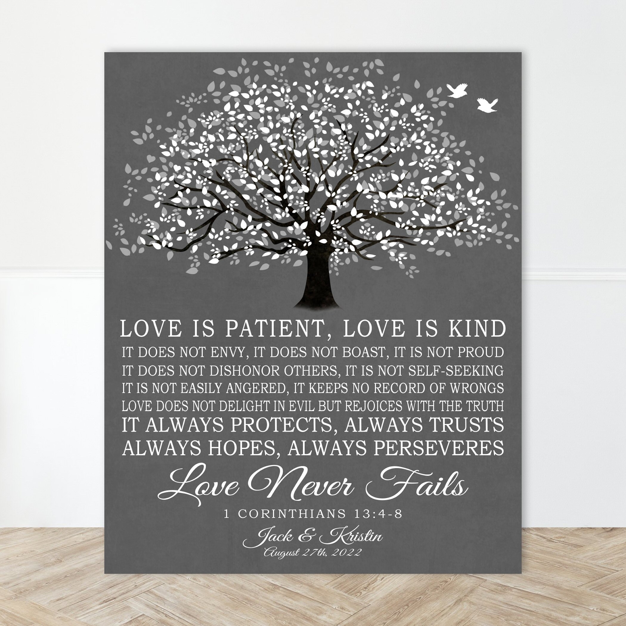 Beautiful, keepsake gift for couple or spouse – Personalized Wedding Gift for Couple Love is Patient Scripture 1 Corinthians 13:4-8 PRINT, CANVAS or DIGITAL FILE – unframed – Choose your size – Choose your colors – Read FAQ’s at very bottom ▼ Prints are unframed. Gallery wrapped canvas are ready to hang. (details below) ▼ Proofs are not provided unless requested, this will get your order out faster. Make sure all info is correct. Colors printed will be the same as the first photo shown. ▼ See FAQ’s for turn around time. (or read below) ▼ Any artwork with a gold or wood look: printed to look gold or wood, not shimmery, metallic or real wood. PRINTS: Prints are professionally printed on high quality, archival professional satin sheen, photo paper with pigmented inks. Prints are brilliant, crisp & beautiful & will last a lifetime & beyond if cared for properly. Prints are unframed. Limited sizes available. CANVAS: Gallery wrapped canvas are ready to hang with a finished black backing & pre-installed hanging hardware. Printed with acid free ink that will last without fading or chipping, on high quality, artist grade material & a scratch-resistant UV coating. Canvas are lightweight yet super durable with a 1.25″ inch deep frame, tight corners & a solid front panel, which means no sagging or stretching! DIGITAL FILES: Digital files are JPEG files sent via email. You print these yourself or have them printed anywhere that prints photos – super easy & a good choice when you’re in a hurry. When ordering a digital file just let me know the size you want in the personalized section. You will receive your digital file via email in 4-8 business days. If you need it within 24 hours (business days) select RUSH PROOF in the shipping options at checkout. Nothing is physically mailed when ordering a digital file. Please note: once your order goes into production refunds cannot be issued & changes cannot be made. Your artwork is carefully packaged & insured for a safe arrival! 11×14 & smaller unframed prints are shipped via USPS. Canvas’ are shipped via UPS ground. Shipping times vary, on average you can expect 4-9 days. A variety of sizes are available (8×10, 11×14, 10×20, 12×18, 16×20, 18×24, 20×24, 20×30, 24×36). If you do not see the size you want please ask. I am excited to create something special for you! Thank you Christine Copyright. All rights reserved. Made in the USA photos shown are examples Gift For Christian Couple, Wedding Gift, Anniversary Love Is Patient 1 Corinthians Personalized Custom Made Canvas Print Printable