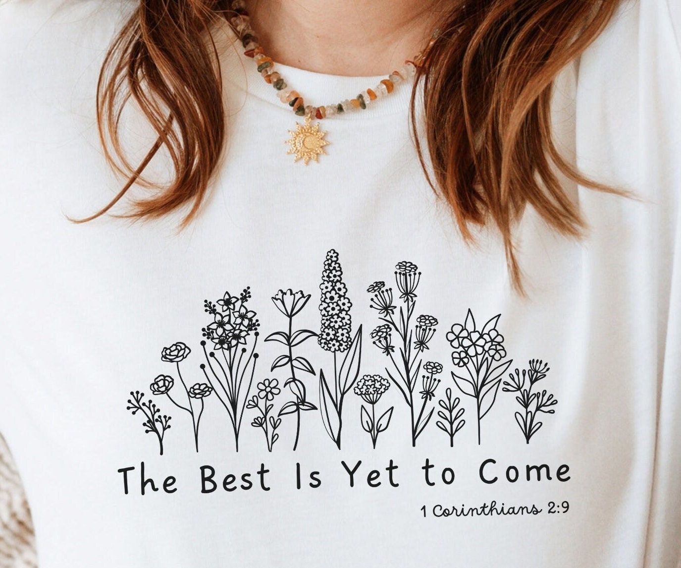 This cute inspirational shirt is a great gift for her! Love the message, love the reference to the beautiful verse, 1 Corinthians 2:9: But, as it is written, “What no eye has seen, nor ear heard, nor the heart of man imagined, what God has prepared for those who love him” The best is yet to come! We love the quality & softness of these Bella Canvas shirts with unisex sizing, & we think you’ll love them too! The PRINT This is a Direct-To-Garment printed item which means ink is printed into the fabric. SIZING & COLORS This unisex t-shirt feels like a well loved favorite. Women should buy their normal size or a smaller size for a more fitted look. See the pictures posted for this shirt to see the sizing chart & colors for this shirt style. If you are unsure about sizing try this: Lay out a favorite shirt you currently have on a flat surface & measure the length of the shirt & measure armpit to armpit. Next compare those measurements to the dimensions listed in the size chart for this shirt style. If you have a special request for color or the design, we love to personalize orders. Contact us & we will be glad to help! CARE INSTRUCTIONS For best results, wash inside out in cold water on gentle cycle. Let air dry or tumble dry low. Do not use bleach or fabric softeners. Do not dry clean. PROCESSING & SHIPPING Please ensure that your shipping address is correct. Each shirt is custom printed just for you. Please allow 2-4 days for your order to be processed & made. Standard shipping times are estimated by USPS as 3-5 business days but may take longer. RETURNS & ExCHANGES Our shirts are custom printed just for you, we cannot offer returns unless the item is defective. We do not offer returns for sizing issues. If the item is defective, please contact us within 2 weeks of receiving the item. Colors may vary slightly depending on the device you are using. Size of the design graphic may appear smaller depending on the shirt size you order. Rolled sleeves in pictures are for styling only. The purchase of this item includes the product described only, props, hats & additional items used in pictures are NOT included with purchase. Please contact us if you have any questions or requests for personalization! This classic unisex jersey short sleeve tee fits like a well-loved favorite. Soft cotton & quality print make users fall in love with it over & over again. These t-shirts have-ribbed knit collars to bolster shaping. The shoulders have taping for better fit over time. Dual side seams hold the garment’s shape for longer. .: 100% Airlume combed & ringspun cotton (fiber content may vary for different colors) .: Light fabric (4.2 oz/yd² (142 g/m .: Retail fit .: Tear away label .: Runs true to size Gift For Her Christian Gifts For Women Inspirational Shirt Faith Wildflower Botanicals Recovery Gardener Best Yet To Come