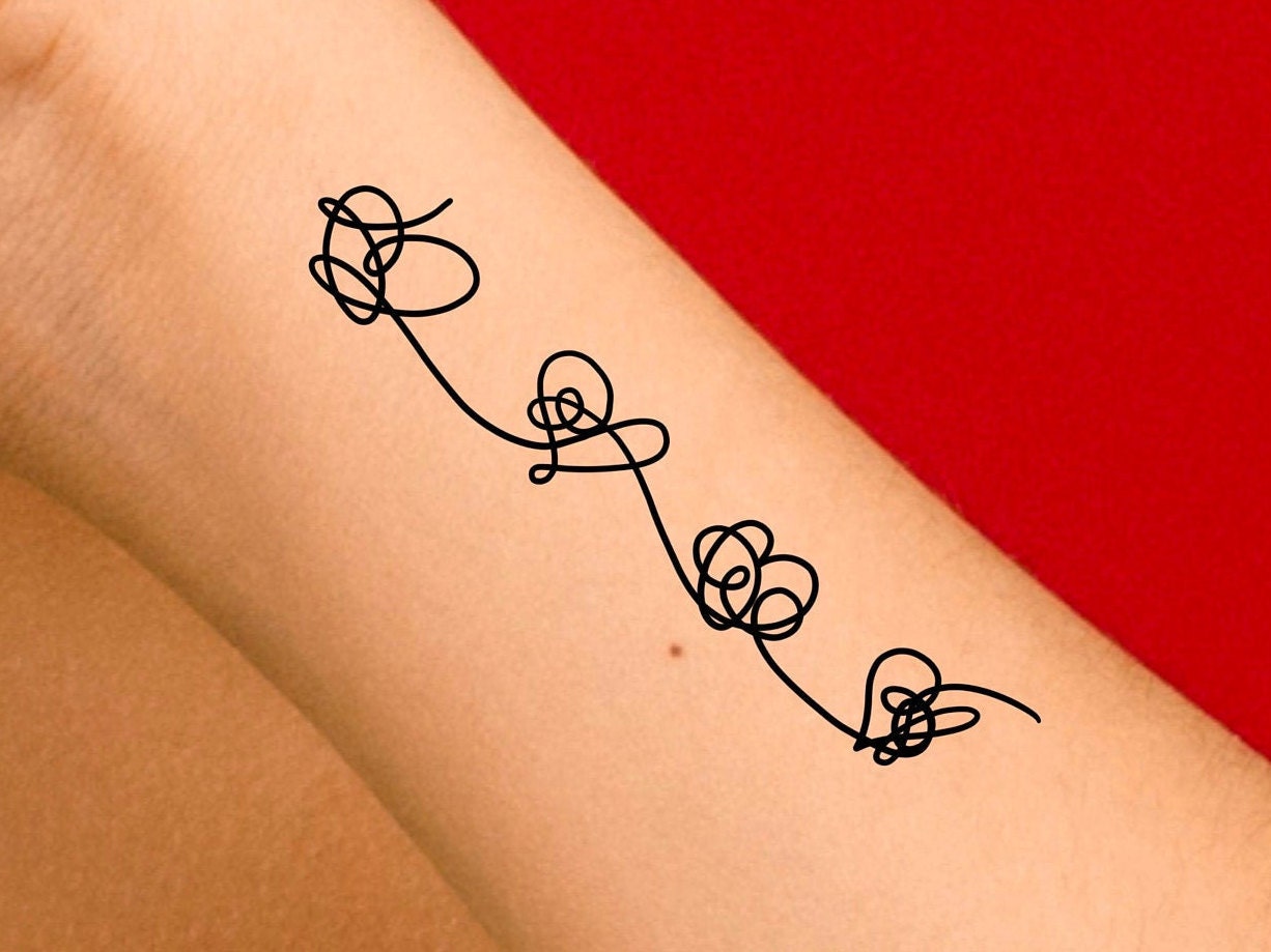 Hearts Temporary Tattoo Size: The size of this hearts temporary tattoo is approximately 3 inches long Directions: 1. Peel away the clear plastic layer 2. Apply the tattoo image side to your skin & cover with wet cloth for 20 seconds. 3. Carefully peel back paper off of skin 4. To remove tattoo wash with soap & water Hearts Temporary Tattoo/Bts Tattoo Heart Love Friendship And