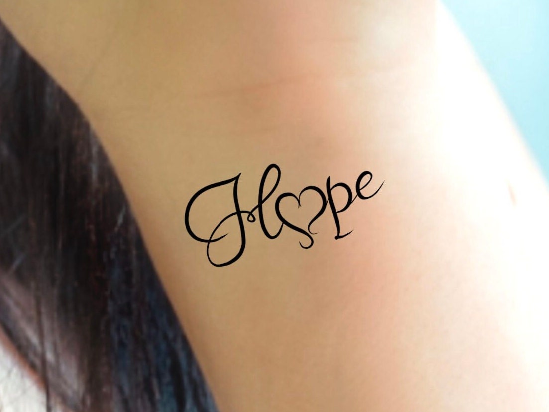 Hope Heart Temporary Tattoo Size: The size of this temporary tattoo is approximately 1 1/2 inches long Directions: 1. Cut excess paper around tattoo with scissors to eliminate any unnecessary adhesive on your skin after applying. 2. Peel off the clear plastic layer. 3. Apply the tattoo image side to your skin & cover with a damp cloth for 20 seconds. 4. Carefully peel back paper off of your skin & allow the tattoo to dry. Do not touch it. 5. Once dry your tattoo should be smooth to the touch & last between 1-3 days as long as you keep it dry. Hope Heart Temporary Tattoo