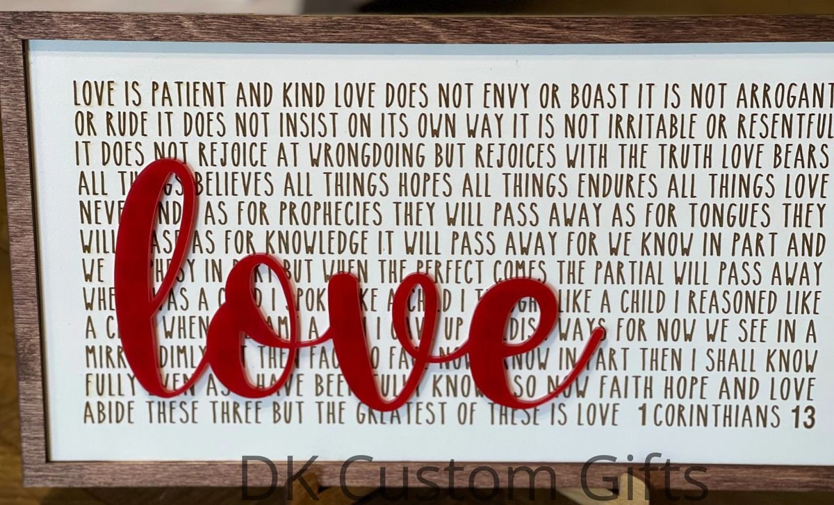 Love Corinthians Scripture Engraved Word Sign Valentines Day.Engraved Sign featuring 1 Corinthians 13 scripture verse, inscribed on 1/8″ baltic birch wood. The word love is created from acrylic. Sign measures 12″ wide X 6″ high. Can be set on a stand ( not included) or hung on wall ( we recommend command strips). Beautiful gift for Valentines Day. Anniversary gift, Wedding gift, or just because gift. Also available in larger sizes. Please allow 4 business days for shipping. Love Corinthians Scripture Engraved Word Sign Valentines Day, Wedding Gift, Anniversary Gift
