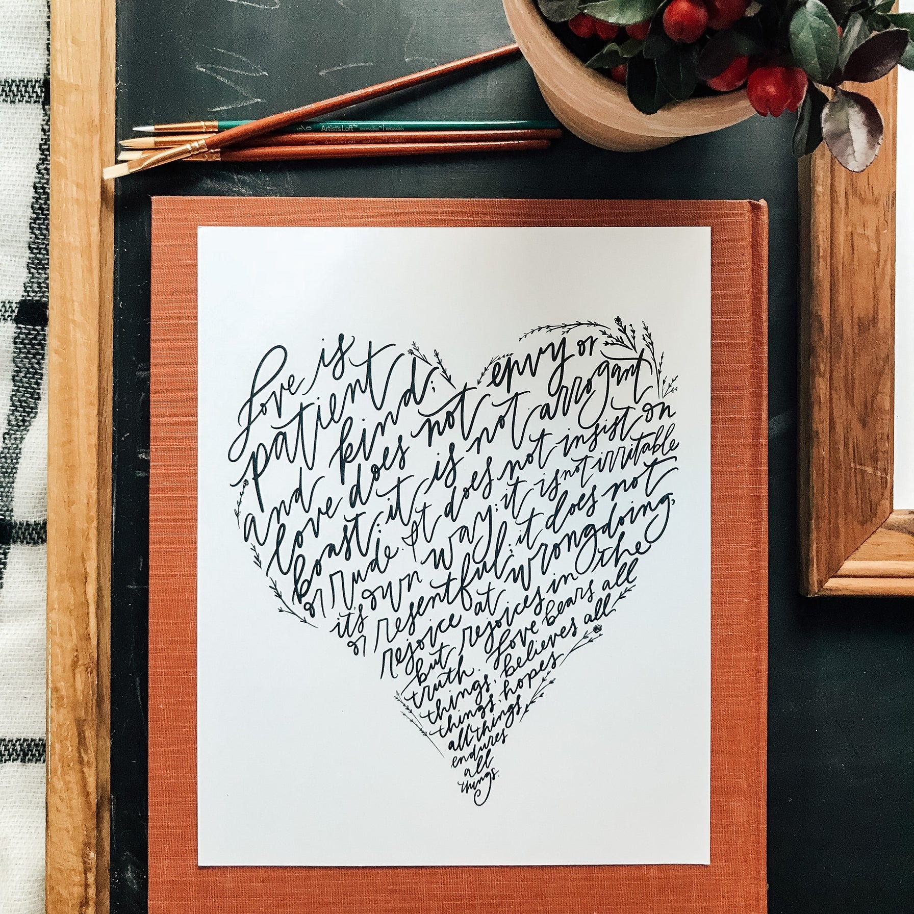 Hand-lettered Modern Calligraphy, 1 Corinthians 13:4-7, “Love is patient & kind; love does not envy or boast; it is not arrogant or rude. It does not insist on its own way; it is not irritable or resentful; it does not rejoice at wrongdoing, but rejoices with the truth. Love bears all things, believes all things, hopes all things, endures all things.” Printed on 100lb matte cardstock. Available in 2 sizes (8×10 or 11×14) you can choose from the drop down menu to the right which size you’d like. Contact us for additional size & color options! All of our prints ship backed with chipboard in a clear cello sleeve in a rigid paperboard mailer to prevent any type of bending! follow along @pipandjpapery on instagram for shop updates, sales, & discount codes! Love Is Patient, 1 Corinthians 134-7, Valentine’s Day Gift, Gift For Her, Him, Husband Wife Last Minute Her