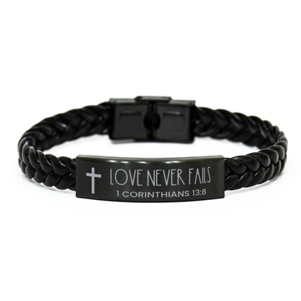 Love Never Fails, 1 Corinthians 138 Bracelet, Bible Verse Christian Dad Gift, Braided Leather Bracelet