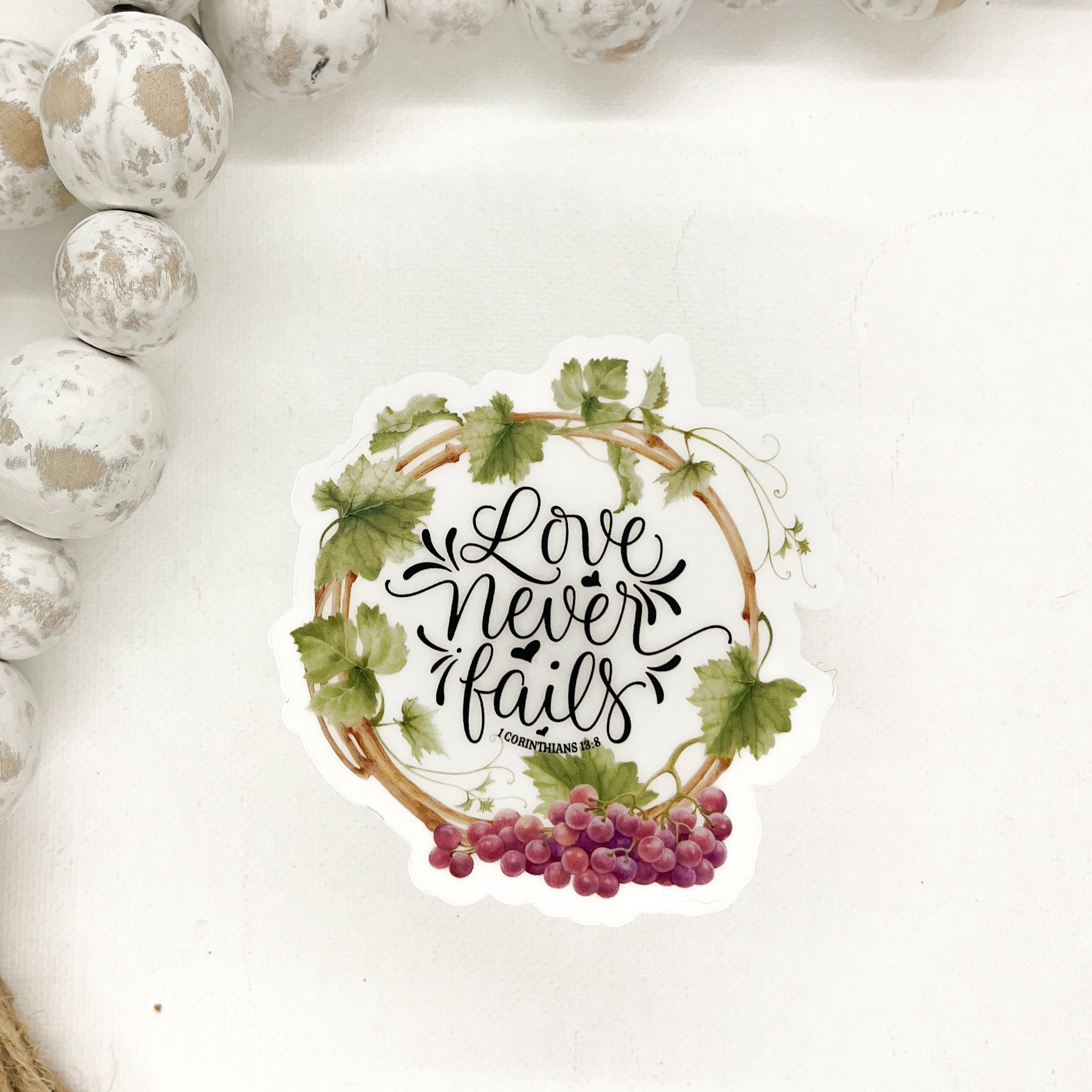 Love Never Fails Sticker, Clear Vinyl Decal, Floral Laptop Water Bottle, Journal Car Accessories, Cell Pone Sticker