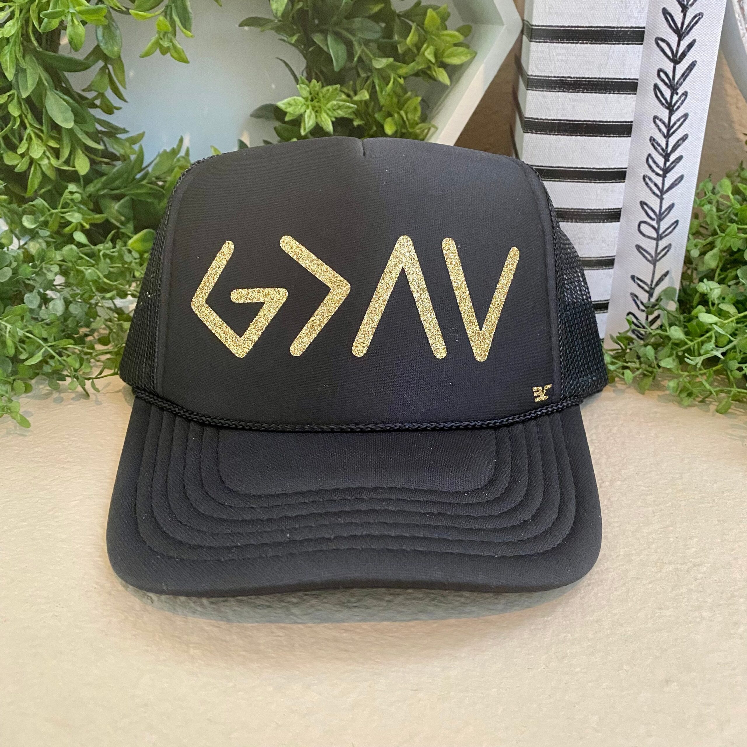 A simple design with a BIG meaning. GOD is GREATER & all things BIG & SMALL. An everyday hat that can easily strike up a great conversation. ❤ One size, snapback ❤ Foam front ❤ Curved Bill ❤ Made with glitter heat transfer vinyl Religious Hats | God Is Greater Than All Things Big Or Small Hat Christian Spiritual Hope & Faith