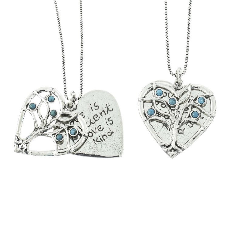 Sterling Silver necklace for woman. Heart necklace with the tree of life set turquoises engraved: Love is patient love is kind The chain measures 45 cm. Prefer a longer or shorter chain? Please specify desired chain length in the “note to seller” at check out. All components are professionally handmade of massif sterling silver. Very heirloom jewel. A thoughtful gift for birthdays, holidays, mother’s gifts or for all occasions Length 45 cm If, for any reason, you are not completely satisfied, please contact us so we can try to solve the problem. Facebook page: https://www.facebook.com/Bluenoemi.Jewelry Follow me on Twitter https://twitter.com/bluenoemi/ Our Youtube channel: https://www.youtube.com/playlist?list=PL46C55B4634769C5C Website: https://sterlingsilverjewel.com Sign up to our Newsletter: https://forms.aweber.com/form/06/1026278506.htm email: bluenoemispain@gmail.com sterling Silver Necklace For Woman. Heart With The Tree Of Life Set Turquoises Engraved Love Is Patient Love Kind