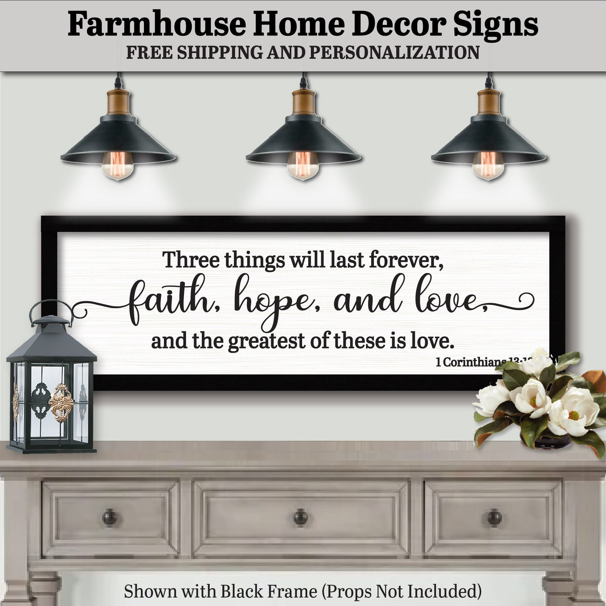 This is a wood-framed sign with a choice of colors & sizes. Always free shipping, & personalization if desired. Farmhouse Home Decor Signs by FarmhousePlaques. The words on this sign are: Three Things Will Last Forever Faith Hope & Love & The Greatest Of These Is Love 1 Corinthians 13:13 We make versatile farmhouse decor signs that mix well with various interior styles. Our signs are trending now, elegantly simple, premium signs made with a sturdy all-wood frame. Shop online with ease, order, & soon you will be hanging a timeless & classic sign. Our packaging is secure, & you can expect your sign to arrive in perfect condition. When you open the box, you will notice the invigorating smell of fresh-cut wood & feel the smooth finish of the all-wood frame. The elegant lettering will spell out an inspirational message to encourage your family & friends. Farmhouse home decor signs will fill the need for creating a welcoming home & will set an inviting tone for your favorite spaces. With small, medium, or large wooden hanging signs, Farmhouse Plaques will help you decorate your home with encouragement & meaning. Feel free to share our pages on your social media! We love to help you & your friends. Our Signs Feature the Following: Solid Wood Painted Frame / Slightly Weathered Look. Choice of Frame Painted Gray, Brown, White, or Black. Choice of Sizes (8×24, 12×36, 16×48.) Sturdy, Lightweight Background Board. Barely Distressed Whitewashed Background. Precision Cut Matte Black Vinyl Lettering. Sawtooth Hanger Hardware Included & Installed. Framed, Modern Boho, Minimalist Artwork. Designed & Handcrafted in South Carolina. Free Shipping & Personalization. Quick Shipping & Secure Packaging. Farmhouse Plaques offers home decor wall art & gift ideas for weddings, birthdays, Mother’s Day, Father’s Day, baby nurseries, gifts for her, gifts for him, personalization, & all family occasions. Something for every space in your home. Room decor for the bathroom, bedroom, craft room, dorm room, entryway, game room, kids room, master bedroom, kitchen, dining room, laundry, living room, baby nursery, office, garage, & man cave. Themes include the beach, cabin, lake house, humorous sayings, inspirational sayings, love, friendship, family, phrases, quotes, & religious. To view our entire collection, the link below takes you to our Etsy storefront: https://www.etsy.com/shop/FarmhousePlaques You may like our section of Bible verse wall art & Christian sayings to add meaning to your home. Click the link below to view our collection of scriptures & inspirational phrases, quotes, & sayings. https://www.etsy.com/shop/FarmhousePlaques?ref=simple-shop-header-name&listing_id=661409525§ion_id=24744607 Each of our items has a personalization option & would include up to 40 text characters that can appear in the lower part of one of our designs to show names or dates. You would click the ‘Add your personalization’ area just below the listing options to add personalization. There