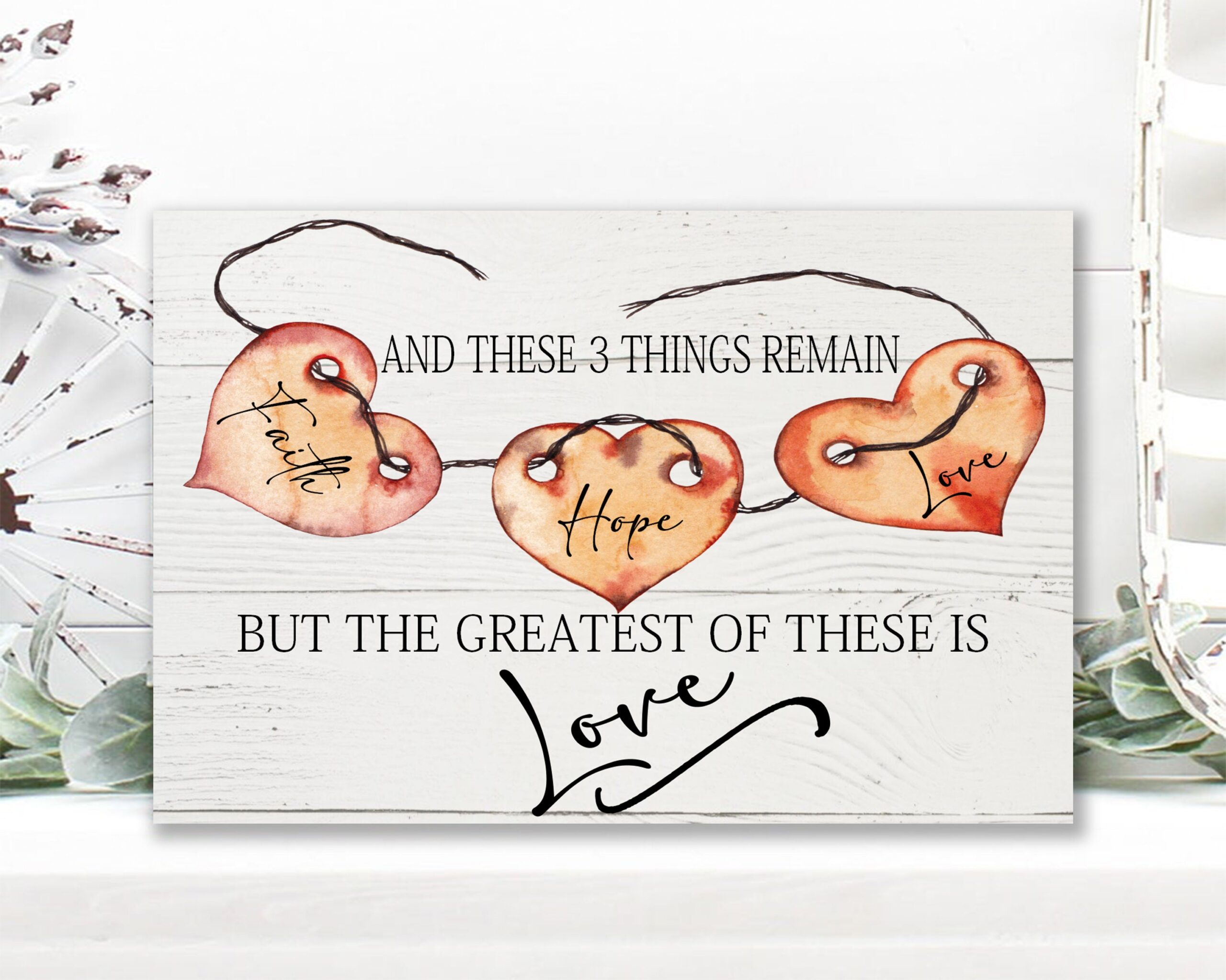 And these 3 things remain…faith, hope & love. But the greatest is LOVE! -Made of ultraboard (light weight dense board) -Available in many sizes -Background is painted White -Design is printed directly onto ultraboard & cured with uv light for long term durability (see video) -Comes ready to hang Valentines Day Decor, Christian Day, Faith Hope Love, & These Three Things Remain, Wallhanging, Plaque