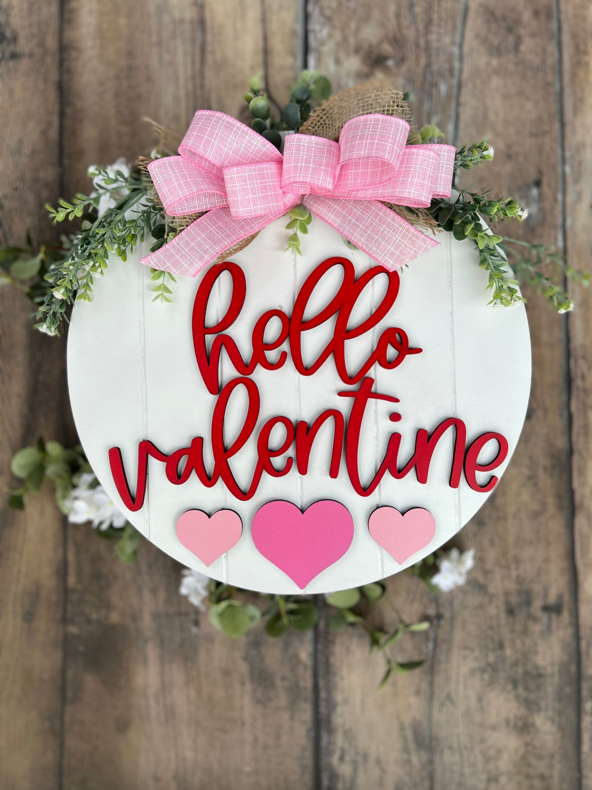 This listing is for a 3D sign that reads: Hello valentine ABOUT THE SIGN: > Words are 3D & are cut from 1/4″ birchwood plywood. > Rounds are 1/4″ birchwood plywood. > Comes with twine attached to the back to hang sign. > Back is unfinished. > in some photos we show greenery behind the sign (Greenery with white flowers) this is not included in the sign but just to give customers a visual of what the sign may look like if they purchase a smaller version for the middle of a wreath. > Signs are suitable for indoor use, or displayed on a covered front door or porch. Direct sunlight may cause your sign to “age” more quickly. Direct exposure to rain may cause your sign to warp overtime. We are not responsible for damage due to exposure to elements overtime. ABOUT SHIPPING: > Please see “estimated shipment date” prior to purchasing > Processing times (the time it takes to create the item) varies for different products. > Handmade in the order in which received > 18″ & 16″ are mailed priority mail (2-4 day), 12″ & 10″ are mailed first class mail (2-6 days); mail delays are out of our control. IMPORTANT INFORMATION: All Tiny Timber Design Co. signs are made from birchwood plywood. Each wood sign will vary slightly from the pictures above. Our signs are made from real wood, which means you may see wood knots, crevices & other imperfections. This is what adds character to every piece & makes every sign unique! Also please note that although the same stain/paint is used on the sign, different woods are going to soak/stain differently so colors may be slightly different than the original. Thank you for visiting Tiny Timber Design Co. Please let us know if you have any other questions, we look forward to creating the perfect piece for your home! Valentine’s Front Door Decor | Valentines Wreath Hanger Sign